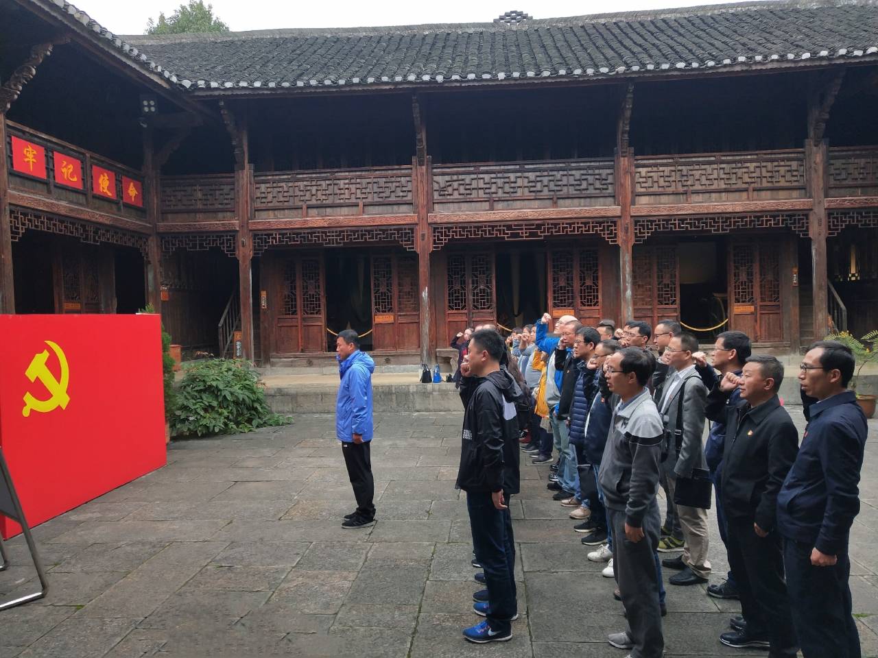 在猴场会议会址门前,党委书记陈椽领誓,全体党员握紧右拳在党旗下重温了入党誓词。誓言铮铮,字字千钧,再次警醒了党员教师的党性意识,点燃了大家爱党、爱国、忠诚、奉献的情怀。