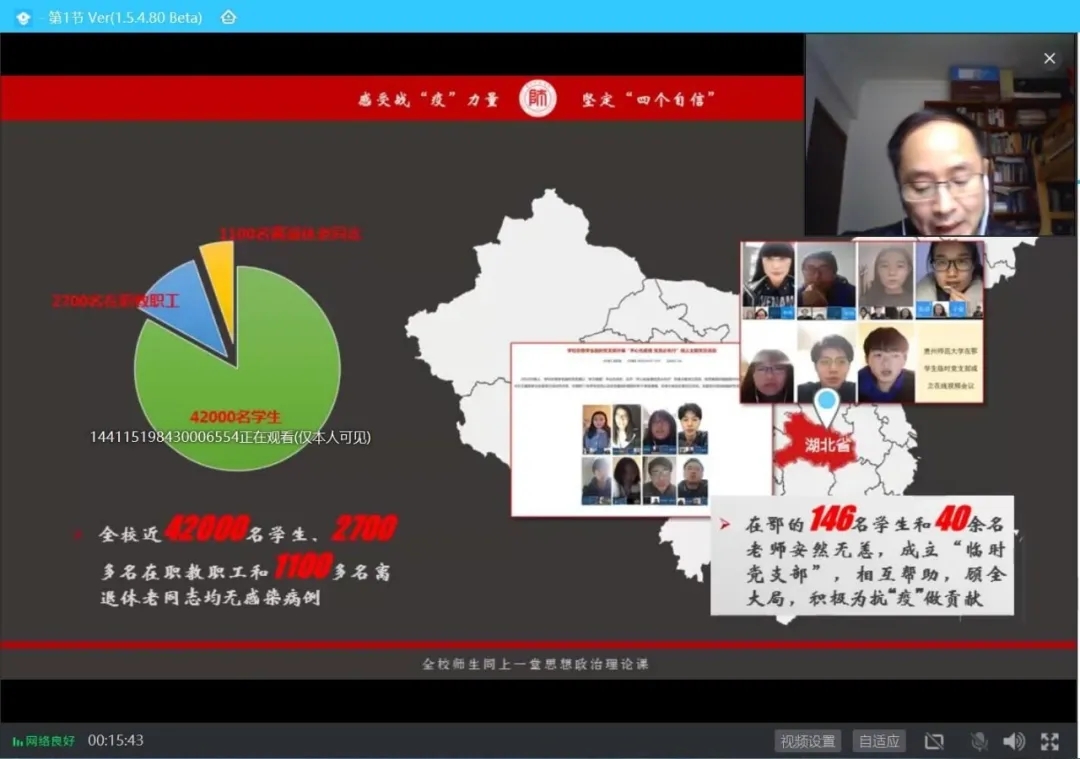 上课伊始,陈椽、吕萍、赵本喜代表公司对同学们表达了深深的牵挂和诚挚的问候,就大家关心的公司和公司疫情防控工作情况作了详细介绍。他们分别从“在数据对比中感受疫情汹汹”、“在‘全国一盘棋’中体会制度优势”、“在全民战‘疫’中展示众志成城”、“在‘山川异域,风月同天’中看人类命运共同体”、“在实干大爱中诠释贵州精神”、“在科技人文中彰显大学之用”、“在知行合一中坚定‘四个自信’”七个方面分享了对打赢疫情防控人民战、阻击战、攻坚战的认识和体会。他们通过讲述国际国内应对新冠病毒疫情的系列举措,中国人民众志成城、共克时艰的生动事迹,贵州政府和人民勠力同心、共同抗疫的感人故事……让同学们充分认识到了人民是历史的创造者,人民是真正的英雄,体会到了人类命运共同体理念的重要意义,深刻理解了中国共产党的领导是中国特色社会主义制度的最大优势,集中力量办大事的制度优势是我们战胜一切困难的根本保证。