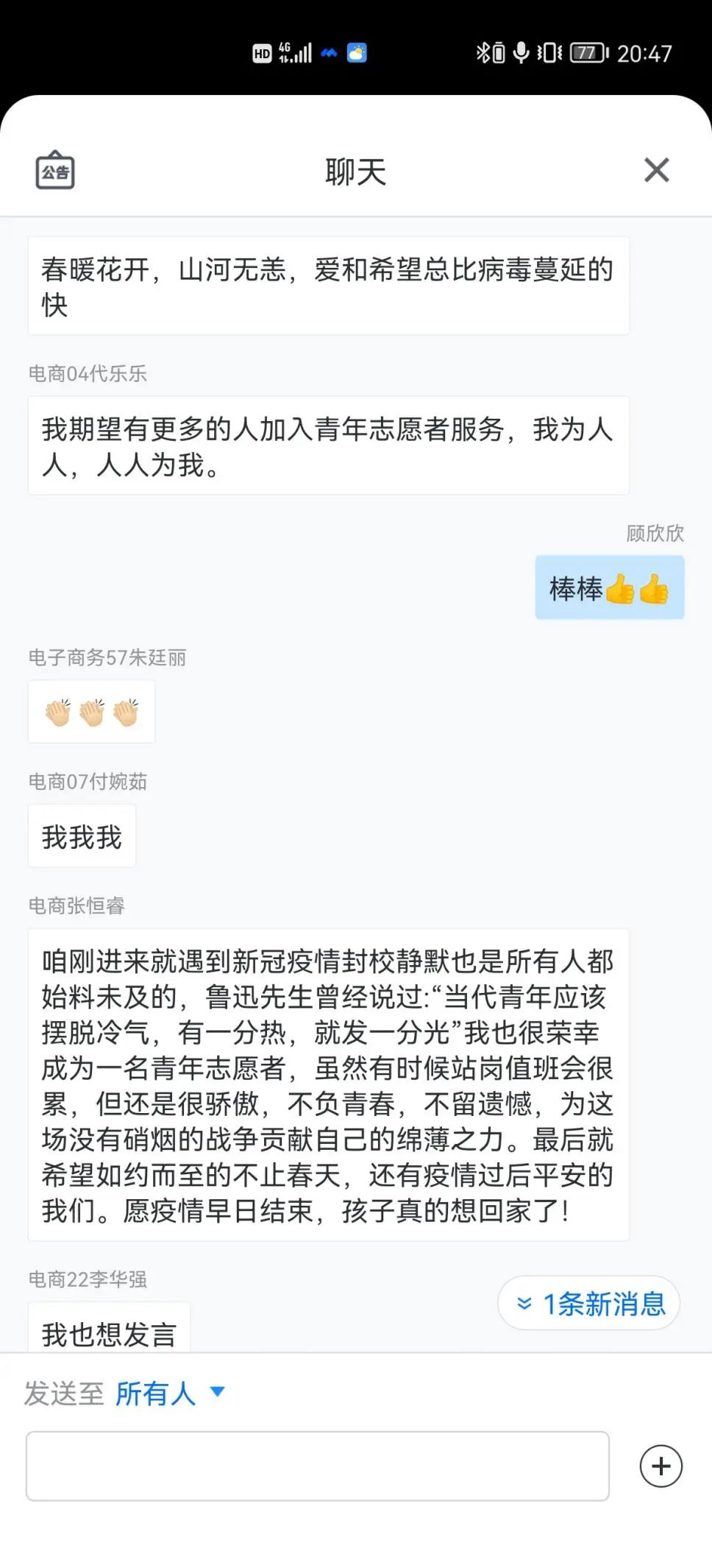2020级经济学专业的同学说:“每一个平凡的身影,都描绘着抗疫前线最耀眼、最靓丽、最让人安心的风景线。是他们不求回报的付出、是他们冲锋在前的勇敢、是他们不忘初心的担当,筑牢了一道又一道抗击疫情的坚实防线”。