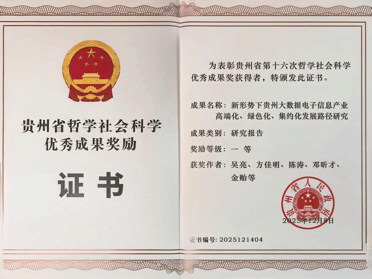 公司教师吴亮、陈涛、邓昕才等的研究报告《新形势下贵州大数据电子信息产业高端化、绿色化、集约化发展路径研究》荣获一等奖。